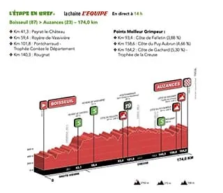 Trois meilleurs grimpeurs viendront également pimenter cette étape, le premier à Felletin à la mi-course, suivie des deux derniers dans le circuit final autour d’Auzances, dont celui de la Côte de Gachard, situé à seulement 9,8 kilomètres, qui est parrainé par le Département de la Creuse.