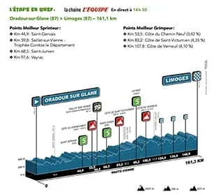 Après être partis de la Communauté de Communes Portes Océane du Limousin, les coureurs traverseront la cité gantière, Saint-Junien, et Rochechouart puis iront se disputer les trois sprints du jour à Saint-Gervais, repasseront par Saint-Junien et Veyrac. Le Sprint Trophée Corrèze le Département sera décerné à Saillat-sur- Vienne, au kilomètre 59,8.