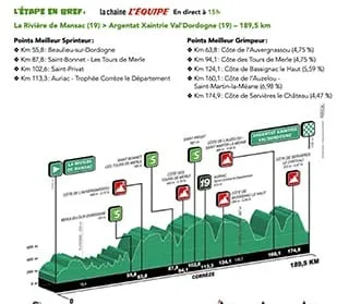 L’étape Corrézienne de ce Tour du Limousin, avec ses 189,5 kilomètres et ses 3400 m de dénivelé, sera l’étape reine de cette édition 2024. Elle mènera les coureurs de La Rivière de Mansac à Argentat-sur- Dordogne à Argentat avec un parcours des plus pittoresques et aux nombreuses ascensions.