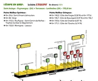 L’étape fera d’abord un périple autour de Saint-Aulaye en passant par La Roche Chalais puis direction Saint- Vincent-Jalmoutiers, Vergt et Montignac-Lascaux. Le Sprint Trophée Corrèze le Département sera décerné à Rouffignac - Saint-Cernin-de-Reilhac, au kilomètre 110,5.