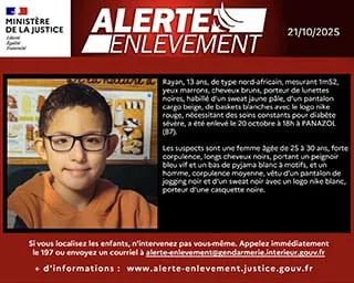Rayan, 13 ans, de type nord-africain, mesurant 1m52, yeux marron, cheveux bruns, porteur de lunettes noires, habillé d’un sweat jaune pâle, d’un pantalon cargo beige, de baskets blanches avec le logo Nike rouge, nécessitant des soins constants pour diabète sévère, a été enlevé le 20 octobre à 18h à PANAZOL (87).