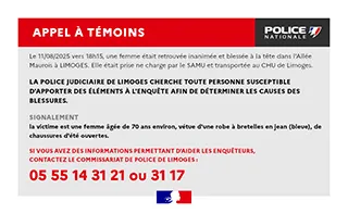 La police judiciaire de Limoges a lancé un appel à témoins à la suite de la découverte le lundi 11 août 2025, d’une femme inanimée et blessée à la tête dans l’Allée Maurois à Limoges.