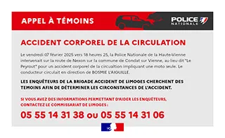 La police de Limoges a lancé un appel à témoins à la suite de l’accident survenu vendredi soir sur la commune de Condat.