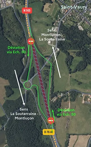 Deux déviations sont mises en place au niveau des sorties et entrées de l’échangeur n°50 à Saint-Vaury, dans les 2 sens pour au moins toute la journée.