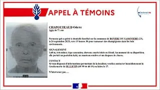 Gendarmerie de la Creuse : "Odette CHAPOUTEAUD est âgée de 71 ans. Elle a quitté le domicile familial sur la commune de Royère-de-Vassivière (23), le mercredi 24 septembre 2025, aux alentours de 13h30, pour ramasser des champignons dans les bois situés à proximité, et depuis elle reste introuvable".