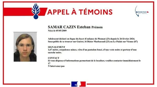 Esteban SAMAR CAZIN est déclaré en fugue du foyer d’enfance de Pionnat depuis le 26 février (Creuse). Il est susceptible de se trouver sur Guéret, St Dizier Masbaraud ou au Palais sur Vienne (dans la Haute-Vienne).