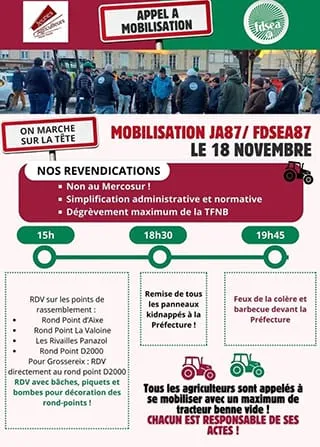 Lundi 18 novembre 2024 plusieurs actions sont organisées à Limoges par la FDSEA et les JA 87