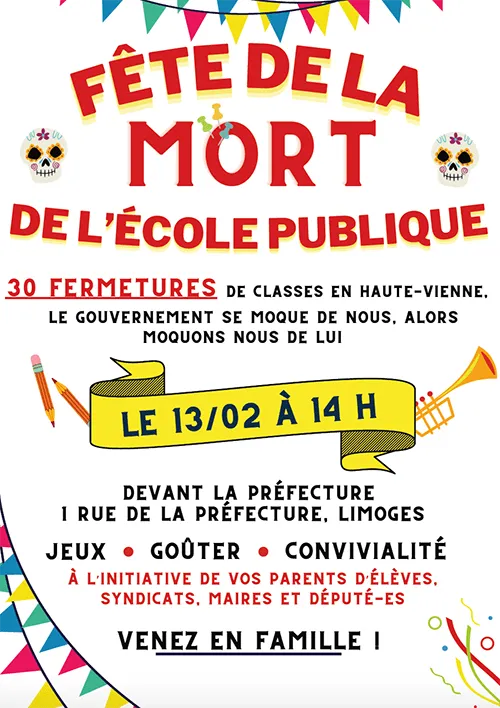 Une manifestation "Contre la mort de l'école publique" aura lieu, devant la préfecture de Limoges, le mardi 13 février 2024 à 14h, date à laquelle se tient la commission décisionnaire.