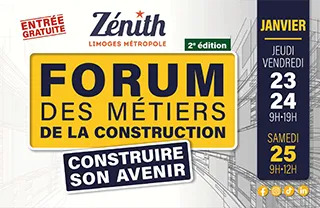 Le Zénith de Limoges Métropole accueillera, du jeudi 23 au samedi 25 janvier 2025, le Forum des métiers de la construction, un événement incontournable pour découvrir les opportunités du secteur du bâtiment et des travaux publics.