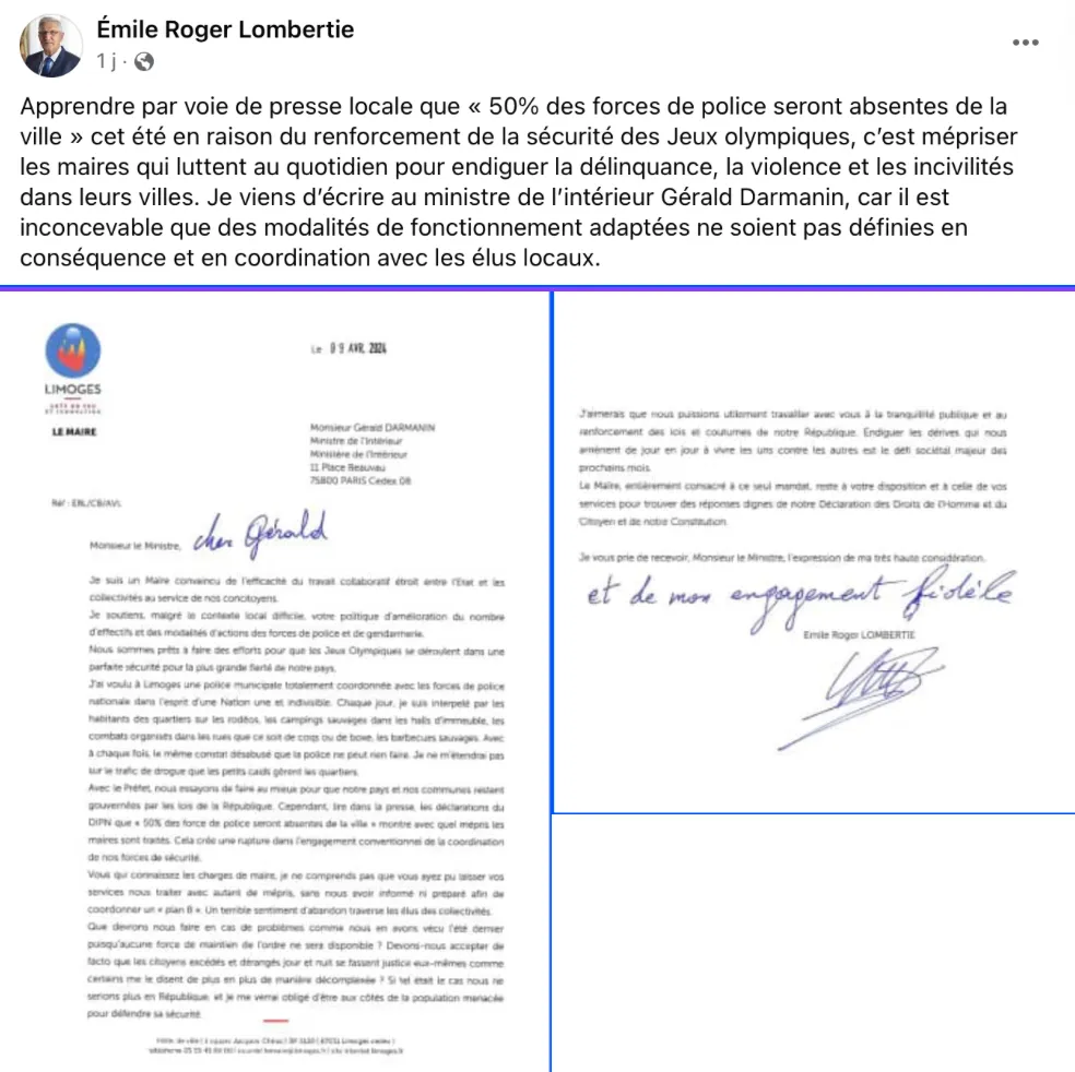 Dans une lettre ouverte cinglante, le maire de Limoges, Emile Roger Lombertie, accuse le ministre de l'Intérieur, Gérald Darmanin, de traiter les maires avec mépris en réquisitionnant une partie des effectifs de police pour les Jeux Olympiques de Paris. Alors que le préfet assure que la sécurité sera maintenue, la polémique enfle sur la mobilisation des forces de l'ordre en Haute-Vienne.