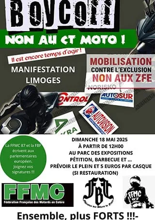 La FFMC 87 (fédération française des Motards en Colère) et la Fédération des Bikers de France organisent une grande manifestation, avec un rassemblement à partir de 12h, le dimanche 18 mai 2025, sur le parking du parc des expos (en face de France 3 Limousin) à Limoges.