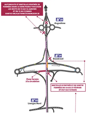 Du mardi 24 février au vendredi 27 février 2026 et du lundi 9 mars au vendredi 13 mars 2026. Un basculement de circulation sera mis en place entre les échangeurs 31 et 28. Les usagers du sens Toulouse-Paris seront basculés sur la vie de gauche du sens Paris Toulouse. Les bretelles d’entrée et de sortie de l’échangeur 29 «Beaubreuil» seront fermées, ainsi que la bretelle d’entrée de l’échangeur 30 «Limoges-Nord».