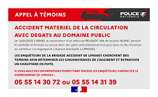 La police de Limoges lance un appel à témoins à la suite d’un accident de la route survenu le dimanche 12 janvier 2025 à 8h au carrefour de la rue Aigueperse / avenue Garibaldi à Limoges.