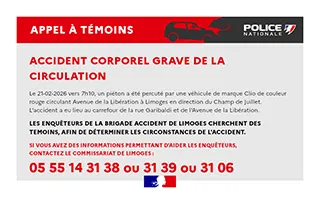 La police de Limoges a lancé un appel à témoins à la suite d’un accident de la route qui a blessé gravement un piéton.