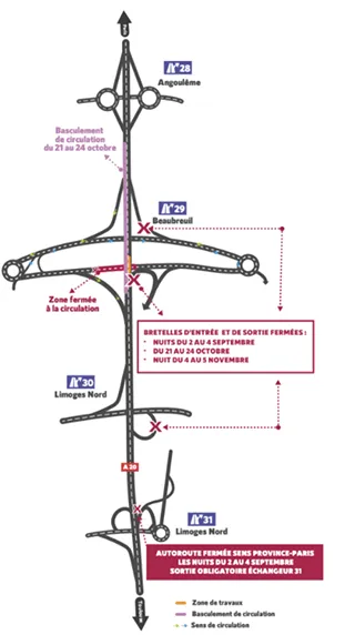 Un basculement de circulation sera mis en place entre les échangeurs 31 et 28. Les usagers du sens Toulouse-Paris seront basculés sur la voie de gauche du sens Paris-Toulouse. Les bretelles d’entrée et de sortie de l’échangeur 29 «Beaubreuil» seront fermées, ainsi que la bretelle d’entrée de l’échangeur 30 «Limoges-Nord». Les usagers devront suivre les différents itinéraires de déviation via la rue des Sabines, l’avenue de Broglie, l’avenue Pierre Mendès-France.
