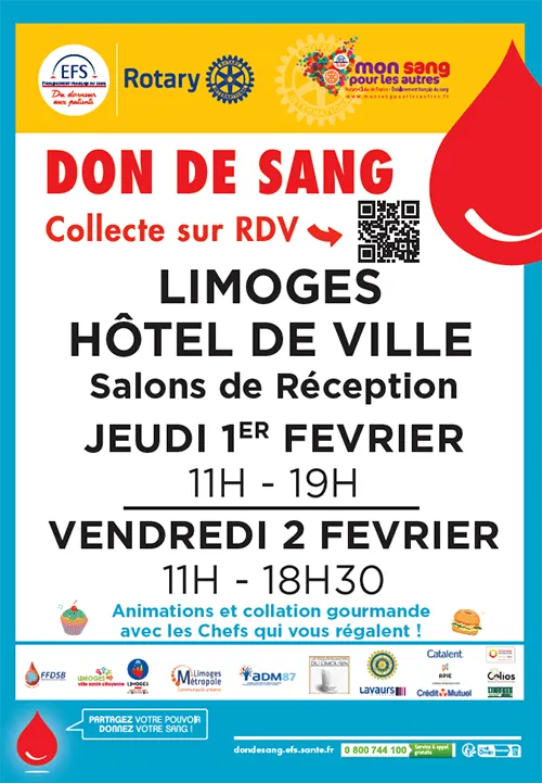L'Établissement Français du Sang (EFS) Nouvelle-Aquitaine, en collaboration avec les clubs Rotary de Haute-Vienne, lance l'événement « Mon Sang Pour Les Autres » (jeudi 1er février et vendredi 2 février 2024), pour renforcer les réserves de sang en ce début d'année. Les salons de réception de la Mairie de Limoges seront le cadre de cette collecte exceptionnelle, soutenue par des partenaires locaux.