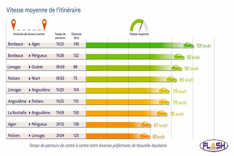 La RN147 est un axe peu performant qui fait figure d’exception en Nouvelle-Aquitaine. Alors qu’une majorité des départements de la Région sont reliés par des 2 x 2 voies (autoroutes ou routes express), la RN147 demeure dans la quasi totalité de ses 110 km un axe bidirectionnel (2 voies sans séparation). Actuellement 1h44 sont nécessaires pour parcourir la distance (110 km). Du centre de Poitiers à celui de Limoges il faut compter 2h04. En cause : la vitesse limitée à 80 km/h et un parcours sinueux ou il est difficile de doubler et plusieurs traversées de bourgs.