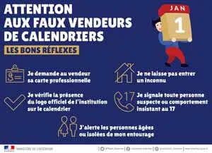 Comme chaque fin d’année la période est propice aux faux démarcheurs et aux vendeurs de calendriers. Certains individus mal intentionnés n’hésitent pas à sonner et à proposer des calendriers au nom de certaines associations alors qu’ils ne sont pas accrédités. N’hésitez pas à demander la carte professionnelle des personnes qui sonnent à votre domicile.