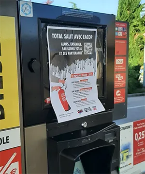 L’objectif était de dénoncer « les investissements gigantesques de la firme dans les énergies fossiles ». Sur les pompes, les activistes ont collé des affiches « Total salit Eacop. Eacop est une bombe climatique, une bombe environnementale et une bombe sociale ».