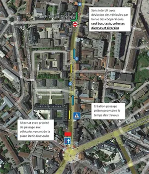- Une déviation des véhicules sera mise en place par la rue des Coopérateurs (excepté pour les bus, taxis, collecte diverses et riverains).
