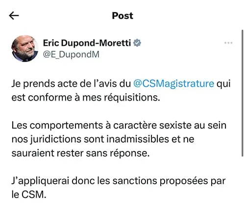 Eric Dupond-Moretti (Garde des Sceaux) a confirmé que la sanction préconisée par le Conseil Supérieur de la Magistrature contre Baptiste Porcher serait appliquée. "Les comportements à caractère sexiste au sein de nos juridictions sont inadmissibles et ne sauraient être sans réponse".
