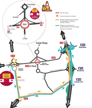 L’accès à la RN 520 sera fermé depuis l’échangeur 28 en direction d’Angoulême et depuis l’échangeur d’Anglard en direction de l’autoroute A20. La nuit, l’accès à Family Village sera maintenu. La journée la circulation sera rétablie avec une limitation de vitesse à 50 km/h, entre les échangeurs et sur le giratoire à 30 km/h.